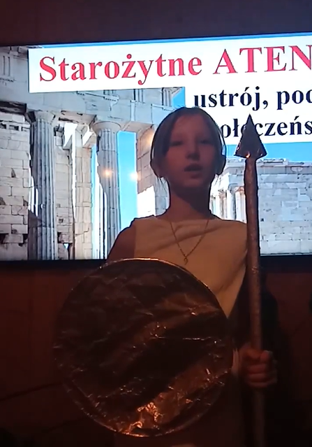 Uczniowie klasy piątej dodatkowo przygotowali pod opieką nauczycielki języka polskiego pani Moniki J.  prezentację bogów greckich.  Wcielili się w bogów olimpijskich i w przygotowanych przez siebie strojach wygłosili monologi na temat bogów olimpijskich.