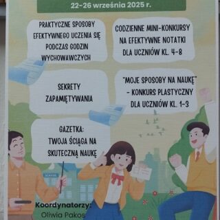 *Tydzień Efektywnej Nauki w naszej szkole!* W ramach akcji uczniowie podczas lekcji wychowawczych poznawali sprawdzone metody skutecznego uczenia się. Rozmawialiśmy o organizacji czasu, technikach zapamiętywania i sposobach utrwalania wiedzy. Na korytarzu zawisła...