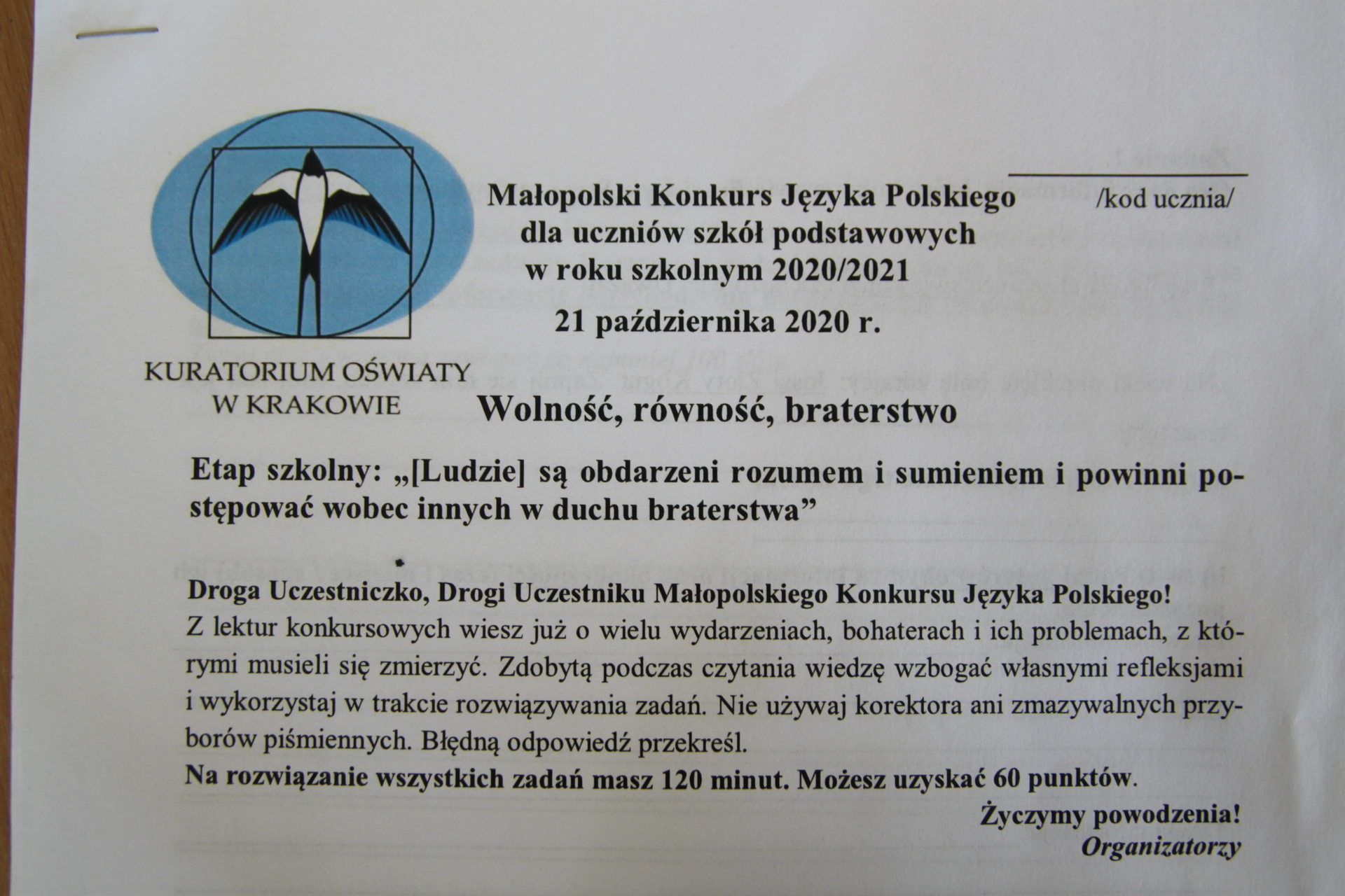 Etap szkolny tegorocznego konkursu odbył się 21 października 2020 r. Hasłem przewodnim były słowa „[Ludzie] są obdarzeni rozumem i sumieniem i powinni postępować wobec innych w duchu braterstwa”.